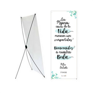 Este banner para boda tiene un sistema fuerte de sujeción en las 4 esquinas. (ollados que permiten sujetarlo al soporte.