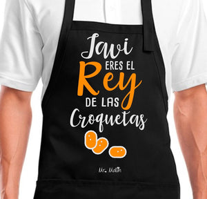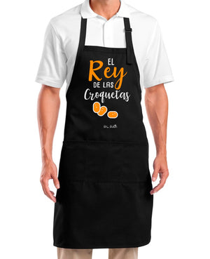 Delantal con peto. ¡Conviértete en el rey de la cocina con nuestro delantal exclusivo! Fabricado con algodón 65% y 35% poliéster, resistente, este delantal te protegerá de las salpicaduras y las altas temperaturas mientras preparas tus croquetas más deliciosas. Su diseño divertido y original, con la frase "El Rey de las croquetas", te hará destacar en cualquier cocina