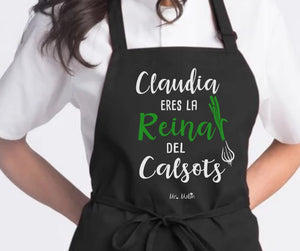 Delantal con peto. ¡Conviértete en el rey de la cocina con nuestro delantal exclusivo! Fabricado con algodón 65% y 35% poliéster, resistente, este delantal te protegerá de las salpicaduras y las altas temperaturas mientras preparas tus Calsots más deliciosos. Su diseño divertido y original, con la frase "La Reina del Calsots", te hará destacar en cualquier cocina