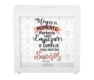 Hucha de madera "Hoy es el momento perfecto para cumplir todos nuestros sueños"