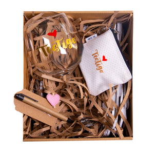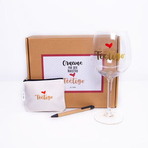El kit esta compuesto por una super copa, monedero y boligrafo presentado en una caja kraff