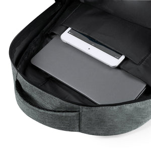 Mochila de negocios en resistente poliéster 600D. Con cierre de cremallera de doble tirador y bolsillo en frontal. Interior con bolsillos acolchados para tablet de hasta 10 pulgadas y ordenador portátil de hasta 15 pulgadas, con estación de carga USB (cable incluido, batería auxiliar no incluida). Bolsillo lateral de redecilla, esquinas reforzadas, asa de transporte acolchada y accesorios en color negro. Espalda y cintas de hombros acolchadas y ajustables.