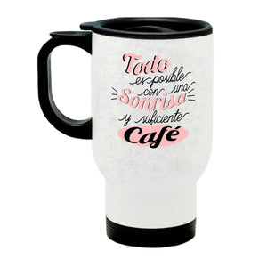 Todo es posible con una sonrisa y suficiente Café" - Taza termo take away